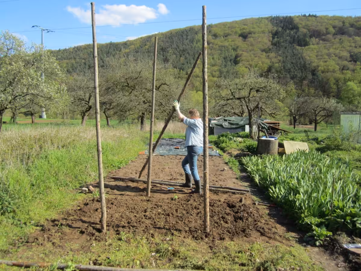 Rankgitter für Bohnen und Erbsen werden platziert und gerichtet