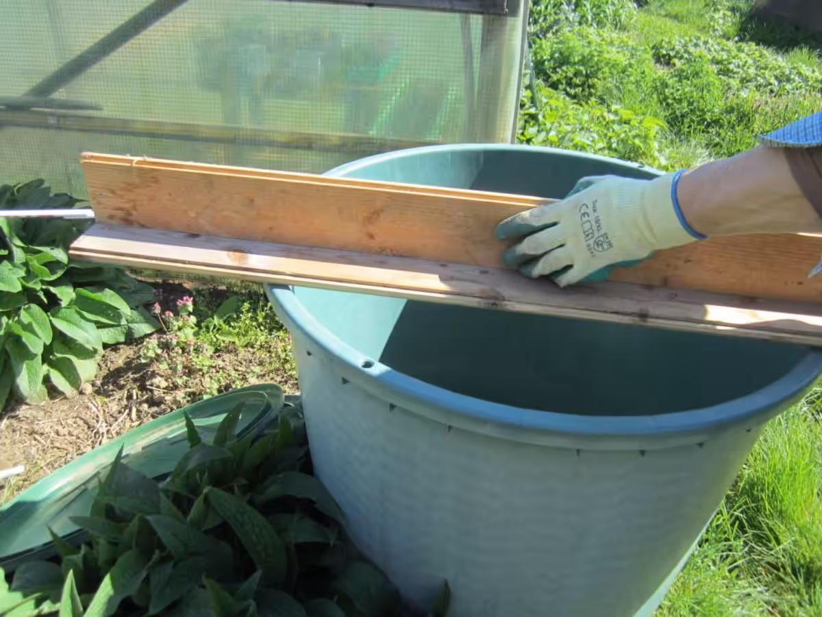 Mittlerweile war es Donnerstag Nachmittag geworden und die Hobbygärtner aus meiner praktischen Biogartenschule kamen zum Arbeiten. Das war der Moment, wo Harry ins Spiel kam, ein sehr handwerklich veranlagter Mitgärtner. Er hat dann mit Eva den letzten Schliff an das Gefälle angelegt und nun passt alles. Innen ist dann noch ein Rest Folie getackert, damit das Wasser nicht aus den Ritzen läuft. Inzwischen hat es schon ein paar mal geregnet, die Tonne ist jetzt 1/4 voll.