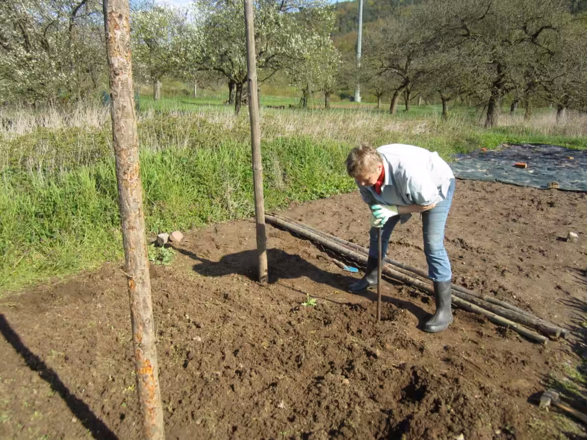 Vor kurzem habe ich mal einen Gastartikel zum Gärtnern mit Kindern geschrieben, dort ging es um genau so ein Bohnenzelt und es war nicht einfach, Fotos für den Artikel zu finden. So habe ich mir gedacht, dass die 8 gigantischen Bohnenstangen, die mir ein befreundeter Förster geschenkt hat, diesmal nicht über Kreuz von meinem Mann aufgestellt werden, sondern als Tippi von uns Frauen. Eine Eisenstange zum Vorbohren für die Löcher tut hier übrigens sehr gute Dienste.