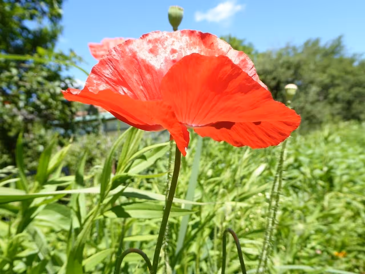 Die rosa Blütenschalen auf dem Videobild sind Seidenmohn, es gibt ihn in vielen Schattierungen von weiß über rosa nach rot. Daher bleibt in meinem Garten auch das helle Rot der Klatschmohns nicht lange hell, sondern es kommt immer wieder zu Farbspielen. Ich kann Dir gar nicht genau sagen, ob der rote Mohn auch Seidenmohn ist, da es viele Unterarten gibt. Auf einmal war er da! Das ist mir wichtiger als sein Name und seine Herkunft. Sehr erfreulich ist es, dass Seidenmohn den ganzen Sommer über blüht. Du kannst ihn z.B. hier bestellen: