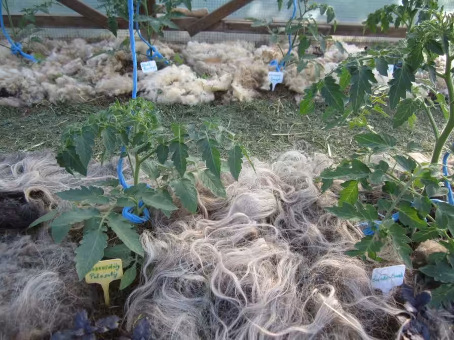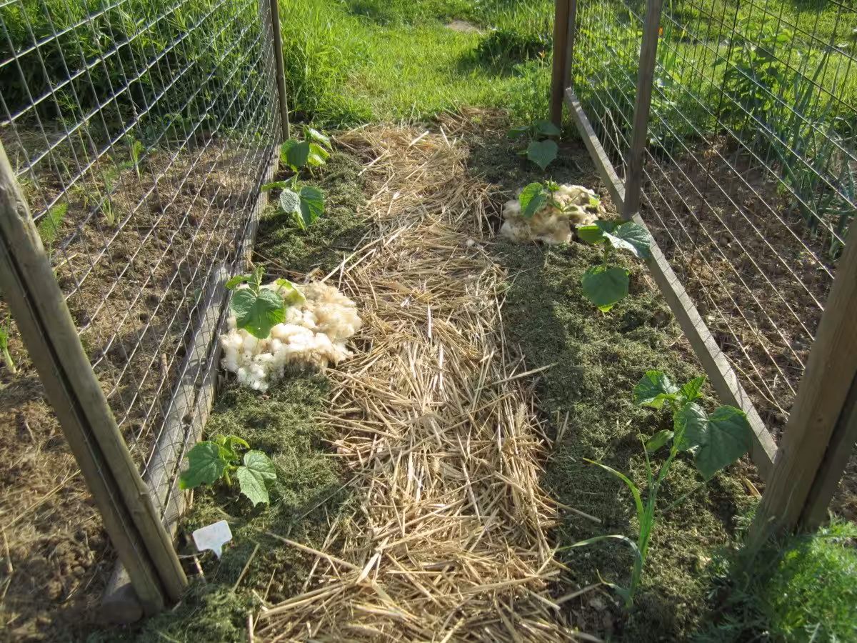 Dieses Jahr mache ich Experimente mit Mulch aus ungewaschener Schafwolle. Hauptsächlich habe ich damit meine Tomaten gemulcht, aber auch Gurken, Auberginen, Yacon und Kartoffeln sind Teil des Experiments. Schafwolle ich ein sehr guter Dünger, wenn er ins Pflanzloch mitgegeben wird. Auch als Mulch hat er eine Düngerwirkung, aber dann dauert es etwas länger. Die Wolle hilft mir sehr dabei, die Verdunstung des kostbaren Gießwassers zu reduzieren, das ist in meinem Fall der Hauptgrund für die Anwendung. Außerdem teste ich, ob sich die Amseln vom Geruch der Schafwolle abhalten lassen, meine Gewächshäuser zu zerwühlen. Das haben sie im alten Gewächshaus bisher gerne gemacht, weil ich dort alles mit Grasmulch abgedeckt hatte. Die Tomaten haben das Scharren immer gut vertragen, aber das empfindlichere Basilikum, welches neben jeder Tomate als Mischkultur steht, wurde teilweise ganz schön mitgenommen. Manchmal war es komplett unter einer Grasmulchschicht begraben.