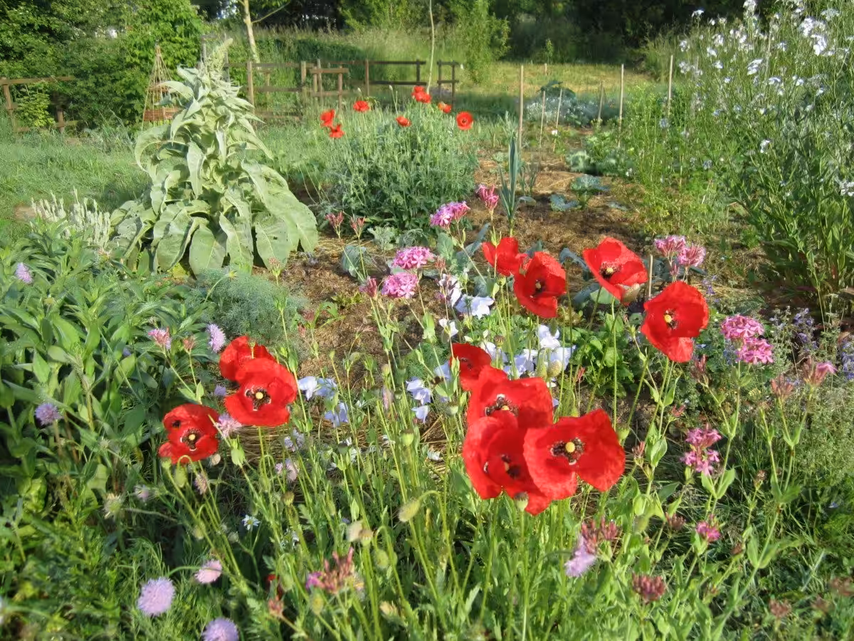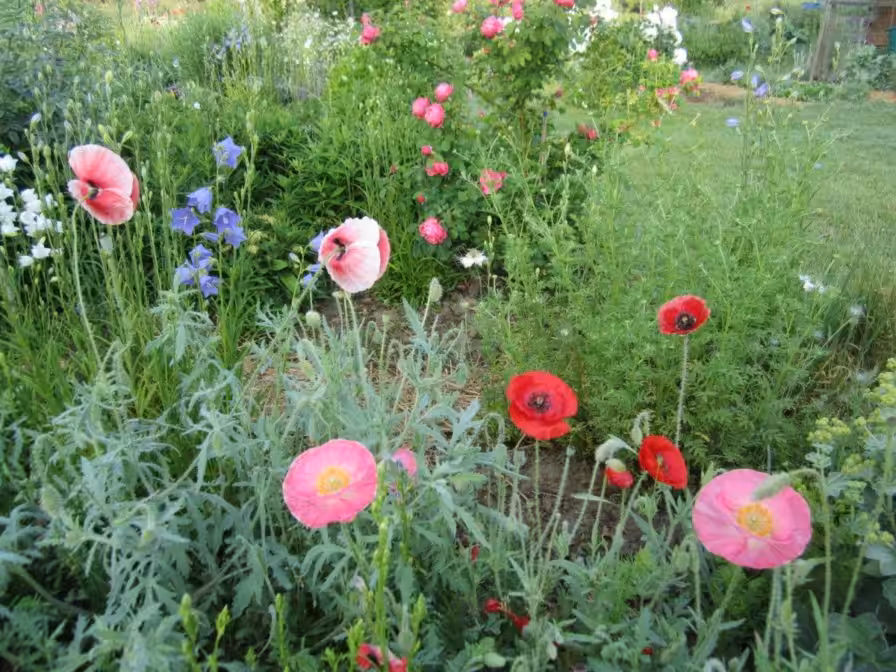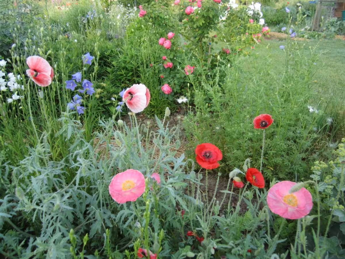 Alle Blumen sind sehr gut mit dem Wetter klargekommen, sowohl die Stauden als auch die Sommerblumen. Der Mohn hat sich sehr gut und schnell entwickelt, er wandert ohne mein bewusstes Zutun durch den ganzen Garten und dort, wo es passt, lasse ich ihn stehen. Manchmal lasse ich ihn auch da stehen, wo es gar nicht passt, z. B. direkt am Weg neben dem neuen Gewächshaus, wo er inzwischen weit in den Weg hineinragt. Noch bringe ich es nicht über das Herz, ihn zu entfernen, aber es ist eine Frage der Zeit, wann meine Nachbarin, meine Gäste und ich überhaupt nicht mehr dort hindurch können. Dann muss er an dieser Stelle leider weichen. 🙁