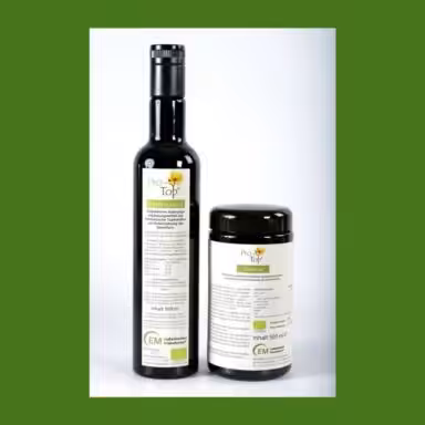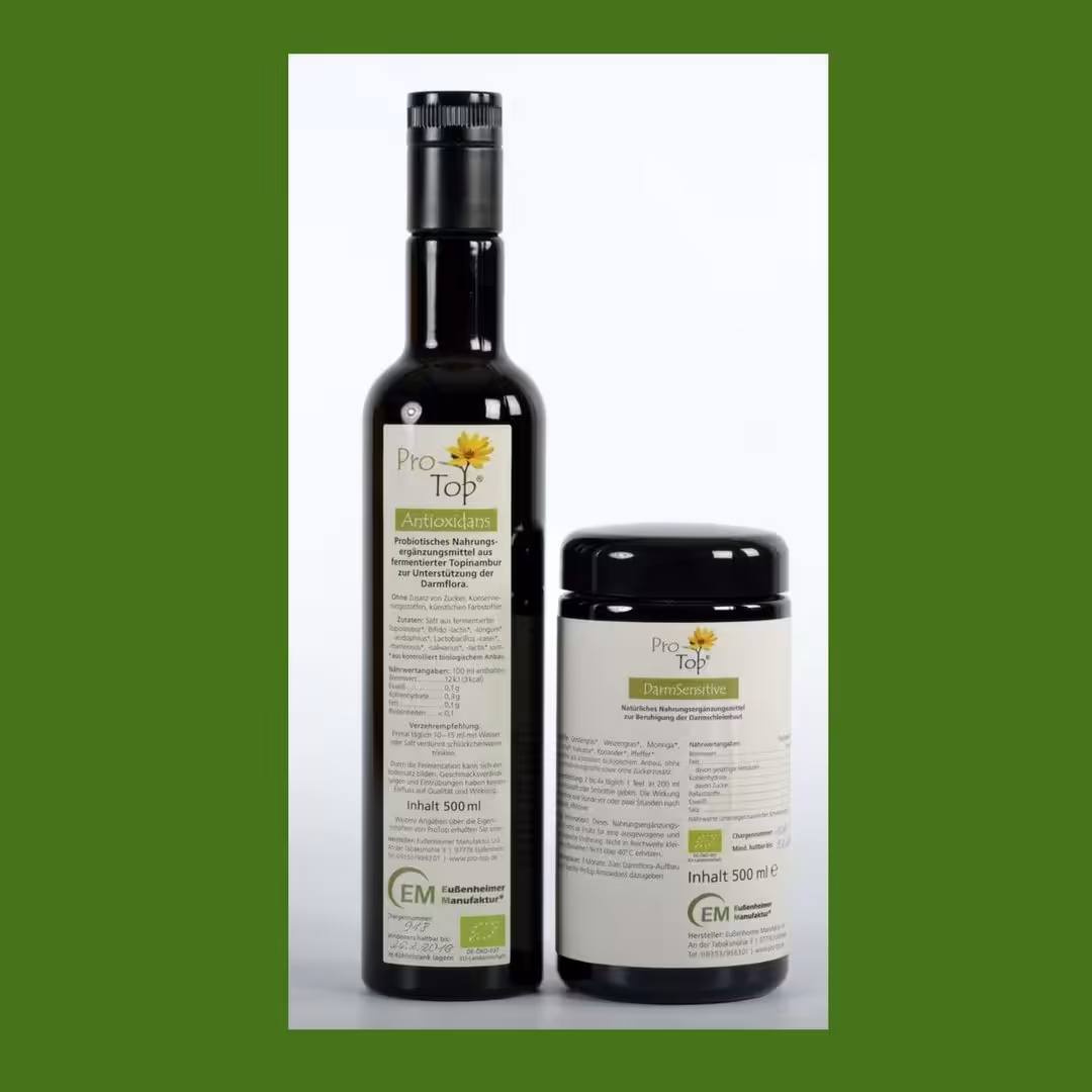 Erhältlich als „DarmPaket 1“ ausreichend für 4 bis 6 Wochen (1 x 500 ml ProTop Antioxidans und 300 g Topinambur-Pulver)