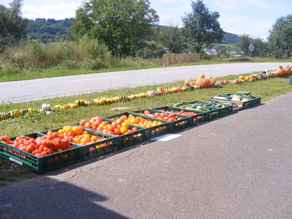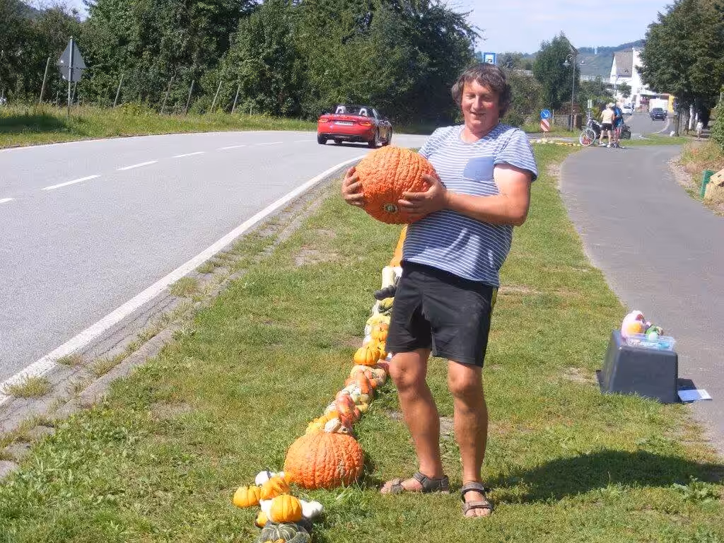 Im schönen Weinort Kinheim an der Mosel verkauft Alexander Stark, bekannt als der Kürbismann von der Mosel, am Ortsausgang seine selbst angebauten Gartenschätze.