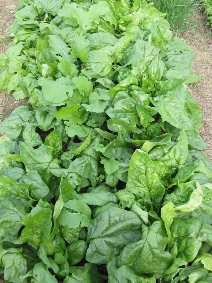 In meinem vorherigen Garten in NRW habe ich mich eine Zeitlang mit einer ganz speziellen Art der Mischkultur nach Gertrud Franck beschäftigt und diese auch begeistert praktiziert. Die Spezialität dieser bekannten Gärtnerin sind die Mischkulturen. Das Besondere daran ist ihre Methode, den Spinat zwischen alle Reihen jeweils alle 50 cm auszusäen. Sie nutzt ihn zunächst als Gemüse, dann aber nach dem Schossen als Trittweg, indem sie ihn einfach abhackt und liegen lässt. Das kommt dem gesamten Boden sehr zugute und ich habe es einige Male so gemacht.