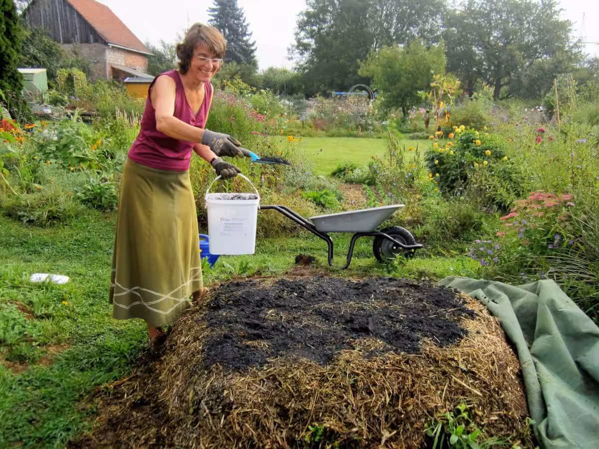 Ich bekomme im Herbst von meinem Nachbarn Schafmist. Diesen staple ich auf. Schichtweise begiesse ich mit EM-Wasser und steue Holzkohle . Ich decke den Stapel Mist dann mit einem grossen Plastik und verdichte alles, indem ich darauf hocke und trample.