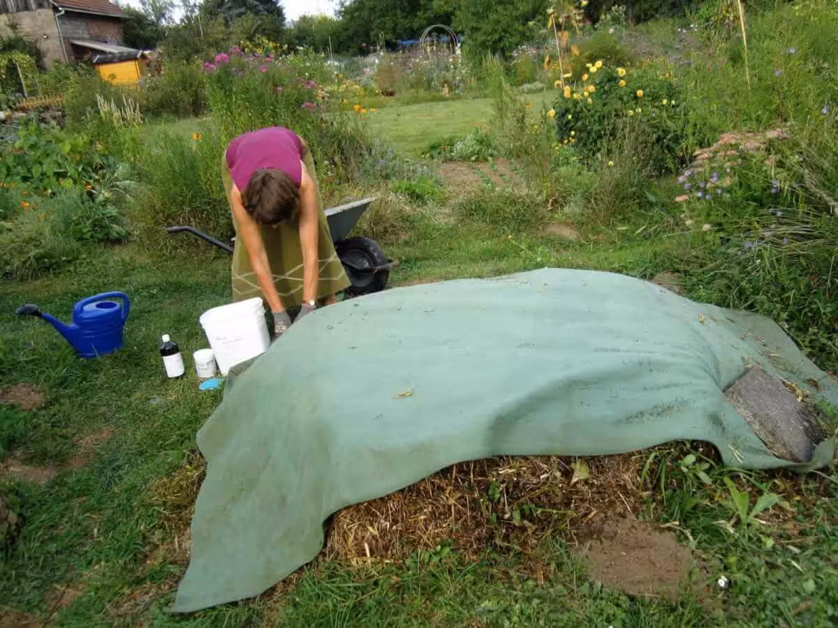 Zum Abschluss sollte noch ein Kompostvlies aufgelegt werden, damit der Starkregen abgeleitet wird. Das ist deshalb nötig, damit der Sauerstoff im Regenwasser nicht das Milieu zu stark in Richtung aerob (sauerstoffreich) verändert.