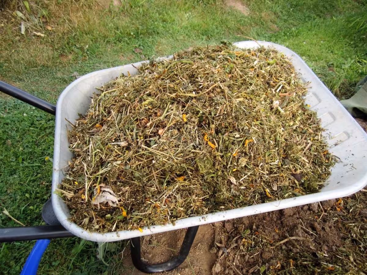 Ein guter Rasenmäher bekommt unglaublich viele Sommerblumen und manches Gemüse klein. Lege z.B. Ringelblumen und Kohlblätter einfach in der Breite des Rasenmähers auf einen Streifen und fahre mit dem Fangkorb drüber. Erstaunlich viel lässt sich so gut klein mähen. Das funktioniert allerdings nicht mehr bei großen Cosmeen-und Sonnenblumenstängeln, die sind leider zu dick.
