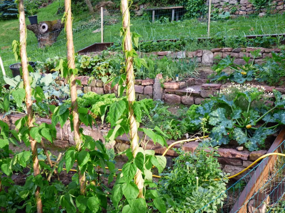Neben dem Anbau von Gemüse und Kräutern haben wir auch Obststräucher, versuchen uns immer gerne an besonderen, essbaren Pflanzen und vor allem die Hochbeete stehen bei uns im Fokus. Auch der Tomatenanbau von Anfang bis Ernte und Verarbeitung hat einen hohen Stellenwert, genauso geht es auch mit dem Anbau in Kübeln, seien es nun Süßkartoffeln oder Wassermelonen – wir probieren es aus und wenn es uns gefallen hat, wird es das Jahr darauf optimiert.
