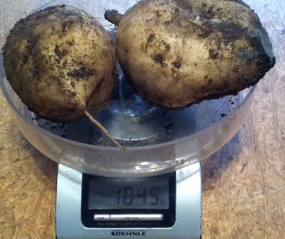 Aus einer einzigen Pflanze kann man eine beträchtliche Menge an Knollen ernten, 6 Kg und auch wesentlich mehr sind nicht ungewöhnlich pro Pflanze. Mit 4 Personen reichen uns 2 Pflanzen gut aus.