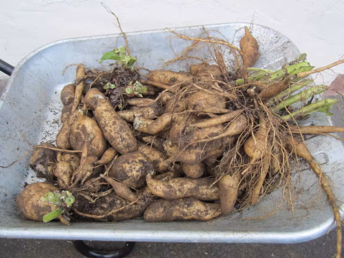 Die Ernte erfolgt nach dem ersten Frost im November (das kann in manchen Gegenden auch schon der Oktober sein). Die Kälte rafft den oberirdischen Teil sofort dahin, auch das ist wieder ganz ähnlich wie bei Dahlien. Nun sollten die Knollen allmählich geerntet werden. Sie werden vorsichtig mit der Grabegabel aus dem Boden gehebelt. Der Geschmack ist am Anfang sehr, sehr saftig und knackig, ähnlich wie bei einem Frühjahrs Kohlrabi (vom Saftgehalt). Noch ist das Aroma nicht sehr ausgeprägt, aber das ändert sich mit den Wochen während der Lagerung im Keller. Nun werden sie immer süßer und sind nicht mehr so wässrig. Es kommt noch eine äußerst delikate, harzige Aromaspur dazu, die man nicht beschreiben kann, sondern erleben muss! Auch durch einige Tage mit direkter Sonneneinstrahlung werden sie ebenfalls süßer. In Scheiben geschnitten und in der Pfanne gebraten sind sie eine Delikatesse. Sie zerfallen beim Braten nicht so wie z.B. Kartoffeln, sondern behalten ihre Konsistenz. Es besteht auch die Möglichkeit, aus den Knollen Sirup zu kochen, was ich selbst aber noch nicht probiert habe.