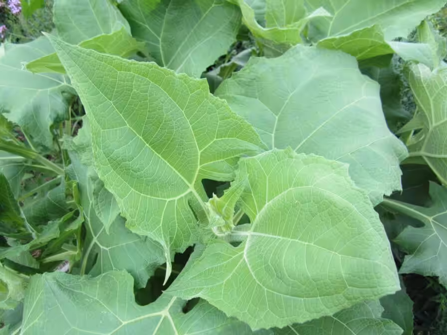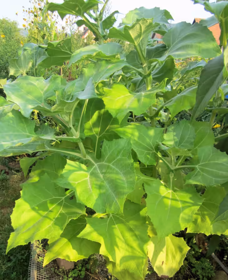 Die Yacons haben sehr ungewöhnliche Blätter. Sie sind riesig und pfeilförmig. Sehr besonders ist auch die samtweiche Oberfläche, sie lädt direkt zum Streicheln im Vorbeigehen ein. Die Pflanzen müssen ab einer gewissen Höhe ein Stützgerüst bekommen, sonst knicken die hohen Triebe leider schnell ab.