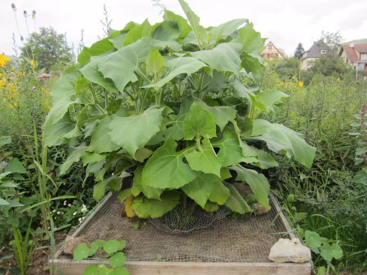 Du darfst die Jungpflanzen daher erst nach den letzten Frösten im Mai setzen. Sie sind zunächst einmal ein bisschen empfindlich gegen Kälte und sollten vor dem Pflanzen allmählich abgehärtet werden. Bringe sie also für einige Tage im Mai tagsüber an die frische Luft, abends müssen sie aber wieder geschützt im Haus stehen. Am liebsten haben sie es sonnig, kommen aber auch mit etwas Schatten zurecht. Bei mir stehen sie sehr sonnig, gegenüber vom alten Tomatenhaus. Sie brauchen viel Platz, am besten planst Du pro Pflanze einen ganzen Quadratmeter ein. Vom Nährstoffanspruch sind sie ähnlich zu handhaben wie Kartoffeln, sie freuen sich also über eine schöne Kompostgabe.