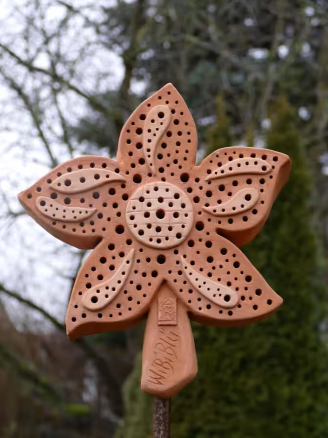 Barbara ist ein echter Naturfreak, unkonventionell und individuell. Man sieht sie entweder mit Hund oder Kamera oder beidem. Was man dabei nicht finden wird, sind saubere oder gar gepflegte Hände. Nicht nur, dass dies durch die Gartenarbeit in ihrem wunderschönen Naturgarten erschwert wird, auch ihre Arbeit in der eigenen Keramikwerkstatt macht dies unmöglich. Barbara widmet einen Großteil ihrer Schaffenskraft dem Leben und den Tieren im Garten. Sie setzt sich aktiv für Naturgärtnen ein. Die abgebildete Wildbienen-Blüte als Nisthilfe gibt es bei Stockhaus-Keramik.