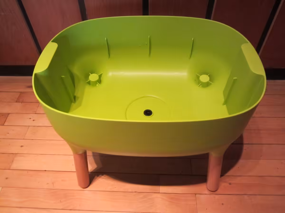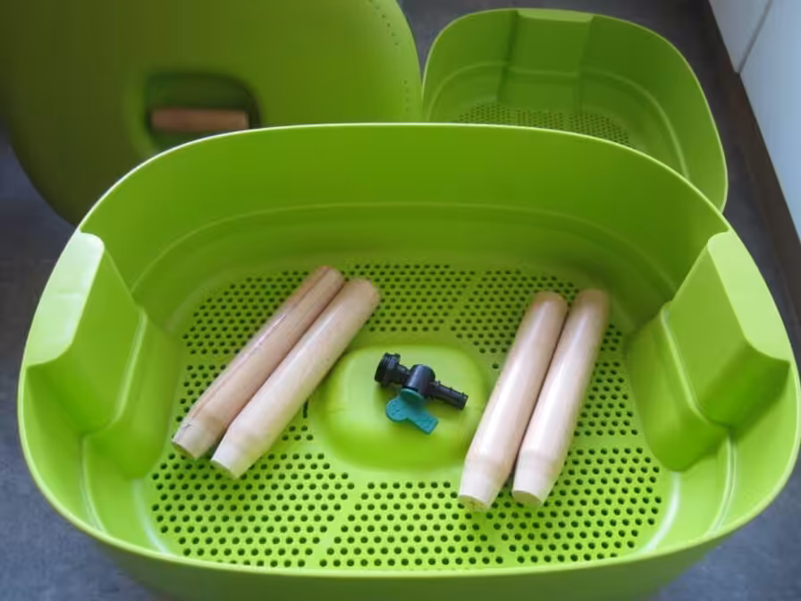 Leider nicht im Bild ist das Zwischengitter, welches mit Gewebe bespannt ist. Es verhindert, dass die Kompostwürmer in den Wurmtee fallen können, der sich nach einiger Zeit bildet.